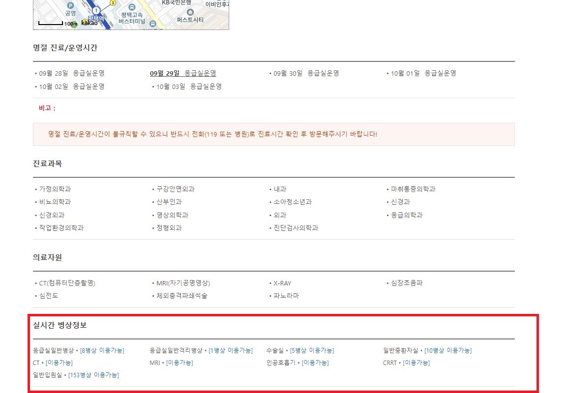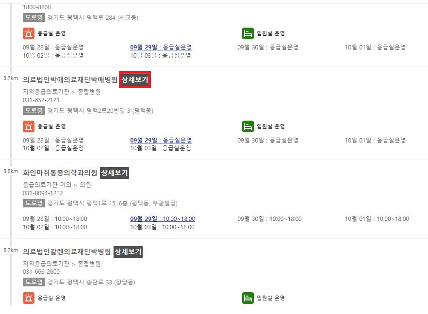 병원 리스트를 확인하신 후 상세 보기를 클릭하시면 현재 병원의 병상정보를 실시간으로 확인하실 수 있습니다.