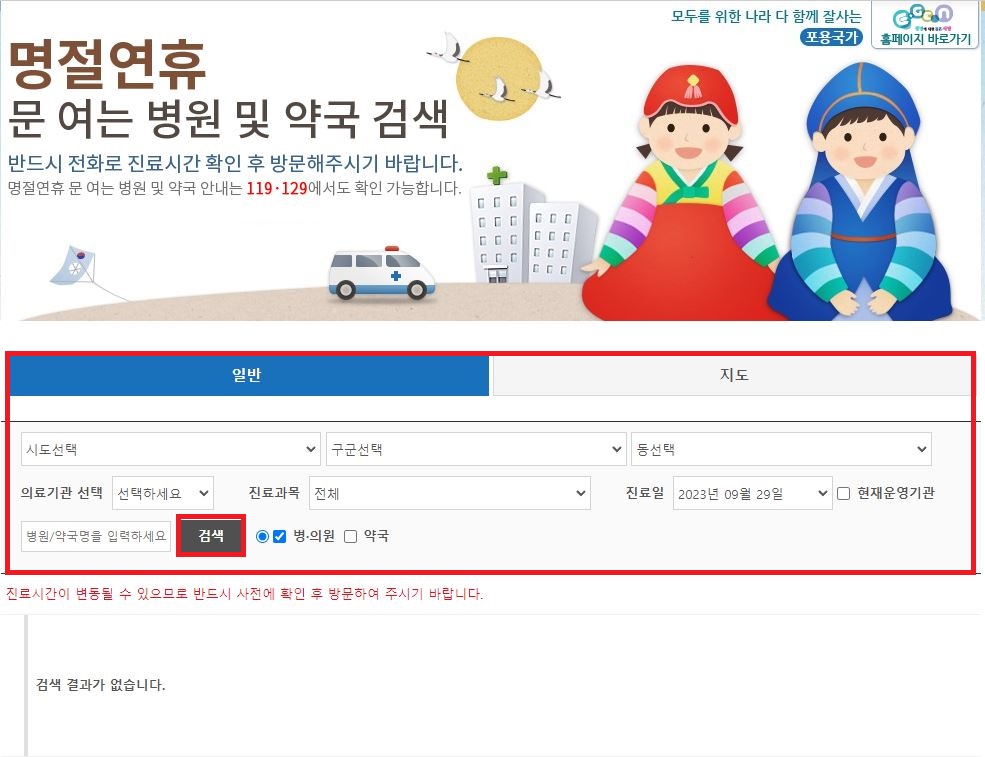 사이트에 접속하신 후 붉은색 부분에 시/구/동 및 진료과목을 설정하고 검색하기 버튼을 누르시면 현재 방문할 수 있는 병원의 리스트가 나타납니다.