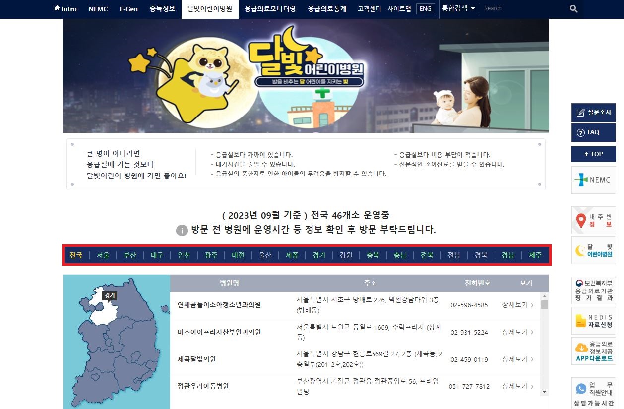 이런 응급상황이 생길 경우에는 응급실은 중앙응급의료센터 홈페이지 이젠(E-GEN)을 통하여 쉽게 위치를 조회하실 수 있으며 약국의 경우에는 Pharm114를 통해, 소아과는 '달빛 어린이병원'을 통해 확인하실 수 있습니다.