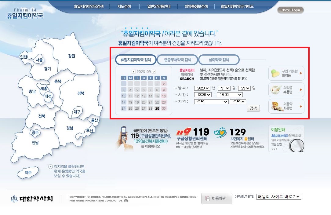 약국을 급하게 찾고 싶으시면 휴일지킴이(Pharm 114) 홈페이지를 확인하시면 빠르게 찾으실 수 있습니다.